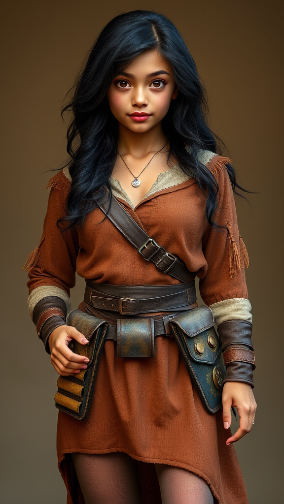 RPG fantasy portrait of a charming young female adventurer with wavy black hair and a rich tan complexion, her large enchanting brown eyes radiating warmth and intelligence. She stands confidently, adorned with a thick leather belt featuring numerous pouches, and wears a long, flowing fantasy tunic paired with cloth tights. Her attire is complemented by sturdy leather armor, emphasizing her wide hips and adventurous spirit. The scene captures the essence of the fantasy genre in stunning UHD, HDR, 8K quality, highlighting the vibrant details and vivid colors of her appearance and attire.