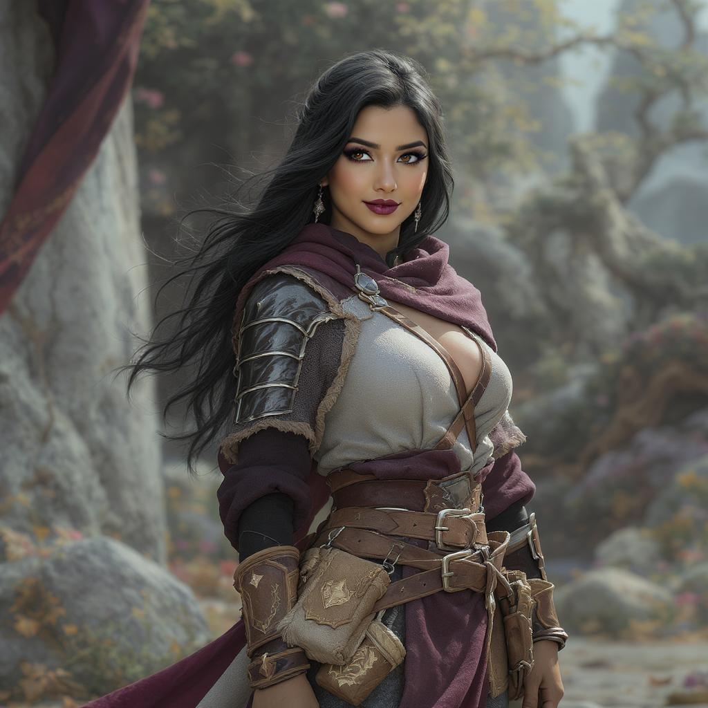 RPG fantasy portrait of a charming young female adventurer with wavy black hair and a dark tan complexion, featuring large expressive brown eyes that convey friendliness and intelligence. She stands confidently, dressed in a long, flowing fantasy tunic layered over cloth tights, and is equipped with leather armor. A thick leather belt adorned with various pouches encircles her waist, complementing her wide hips. The scene is set in a vivid and detailed fantasy realm, captured in ultra-high-definition quality, evoking the genre's magic and adventure. The portrait maintains clarity and focus, steering clear of unwanted elements such as disfigurement, artifacts, or duplicates, and ensuring the overall image is crisp and well-composed.