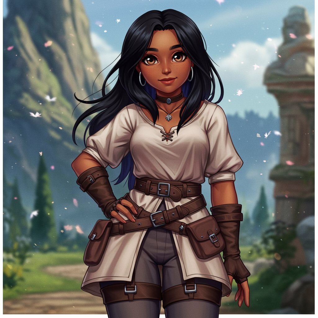 RPG fantasy portrait of a charming young female adventurer, with flowing black hair, possessing a rich dark tan complexion and expressive big brown eyes, exuding friendliness and intelligence. She stands confidently, adorned in a long loose fantasy tunic paired with cloth tights and leather armor, with a thick leather belt featuring numerous pouches. Displaying wide hips, she embodies the essence of a fantasy genre adventurer. The background hints at a magical landscape, UHD, HDR, 8K, ensuring high-quality details. The scene is lively and vivid, capturing the imagination without any distracting elements such as modern attire or poorly rendered features.