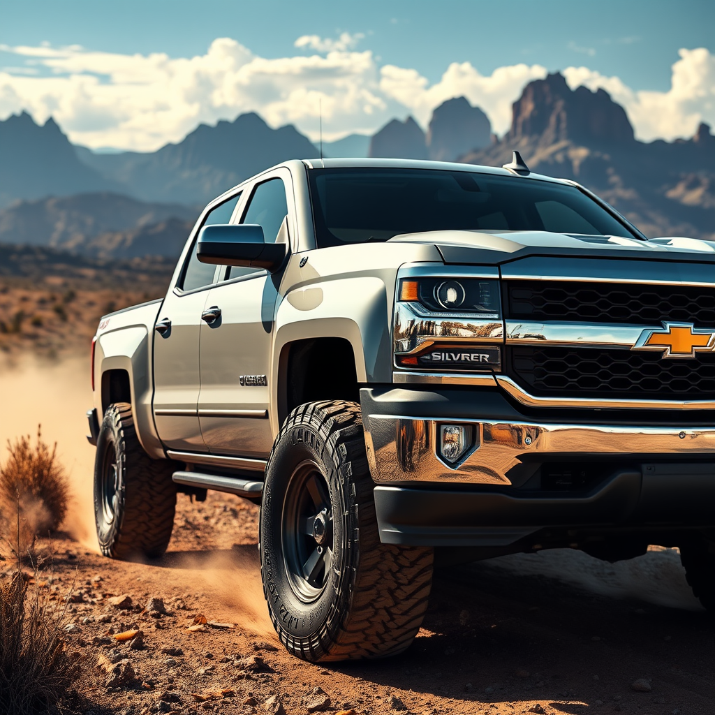 Rugged Chevy Silverado conquering untamed landscapes, embodying strength and adventure with every mile it devours beneath its powerful wheels.