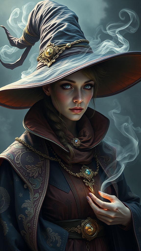 Rugged pointy-nosed sorceress donning intricately embroidered magic academy robes, oversized wide-brimmed bewitched hat with gleaming gems, bold cinematic flair, delicate elaborate lace details, ethereal elegant mist swirling around majestic form, mastery of digital painting, concept art inspired by ruan jia's dark romance and hong soonsang's rustic mysticism, wlop's atmospheric realism, artgerm's steampunk whimsy, greg rutkowski's majestic fantasy, and alphonse mucha's ornate mysticism, with hints of dark gothic drama and soft ethereal glow, rendered in vivid dreamlike colors.