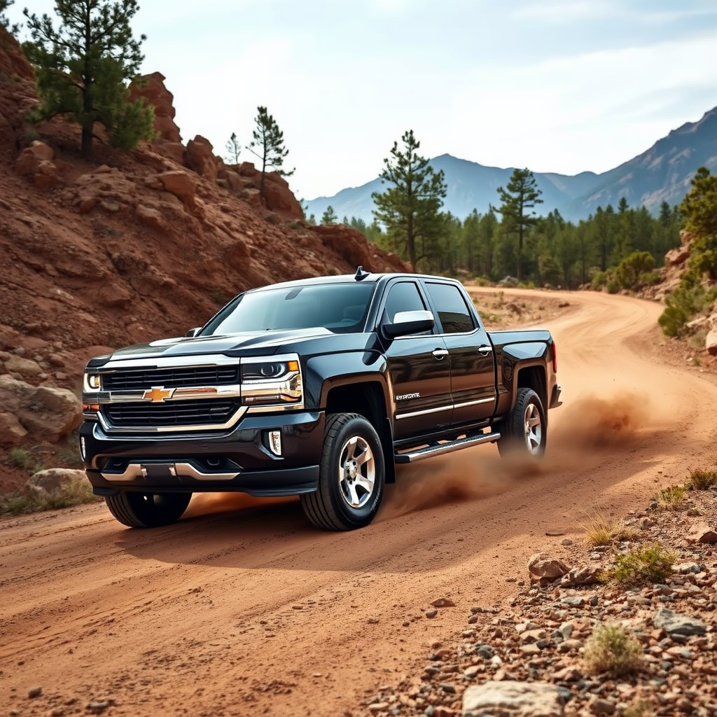 Rugged roads await as the Silverado, a gleaming beast of steel and power, roars through untamed terrain with relentless determination.