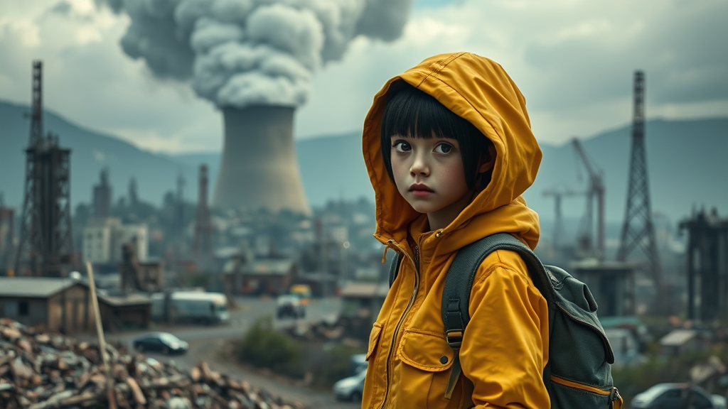 Ruined city landscape with a looming nuclear power plant in the background. A solitary girl stands in the foreground, her gaze meeting the viewer. She wears a distinctive yellow jacket, the hood resting behind her head, and carries a hunting backpack. The scene is infused with an atmosphere of radiation, rendered in 8k UHD HDR with a trending art style. Volumetric lighting creates depth, captured as if through an octane render technique. The girl's features are subtly mutated, with slightly elongated neck and unusual fingers, hinting at the harsh environment's impact. Despite these mutations, her cross-eyed glance remains steady. The photograph is sharply focused, avoiding low resolution issues, cropped elements, or any digital artifacts like watermarks or logos.