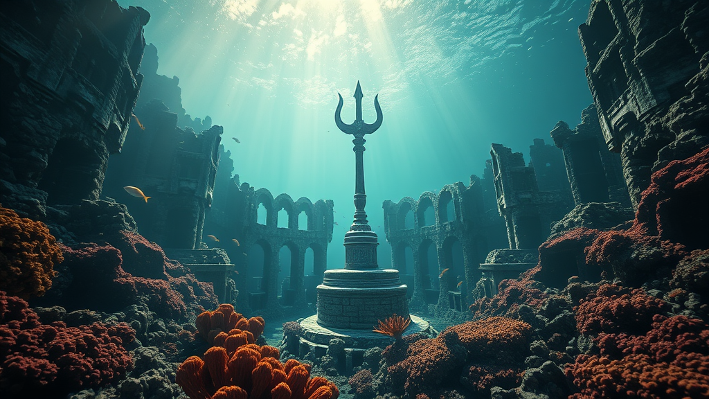 Ruins of an ancient, abandoned city, submerged at the ocean bottom, in the style of Edwin Deakin. Ethereal and mystical ambiance with a haunted presence, overgrown with vibrant coral. Sunrays pierce through the water's surface, creating scattered light and cinematic shadows. Atmospheric scene with volumetric lighting and deep shadows, teeming with sea life, where schools of fish dance around a grand trident statue. The composition features a dreamy bokeh effect with a profound depth of field, illuminated by ray tracing. Imagined in an enchanting, surreal fashion, captured in stunning 16k UHD HDR quality, blending elements of FastNegativeV2, UnrealisticDream, and BadDream for an otherworldly allure.