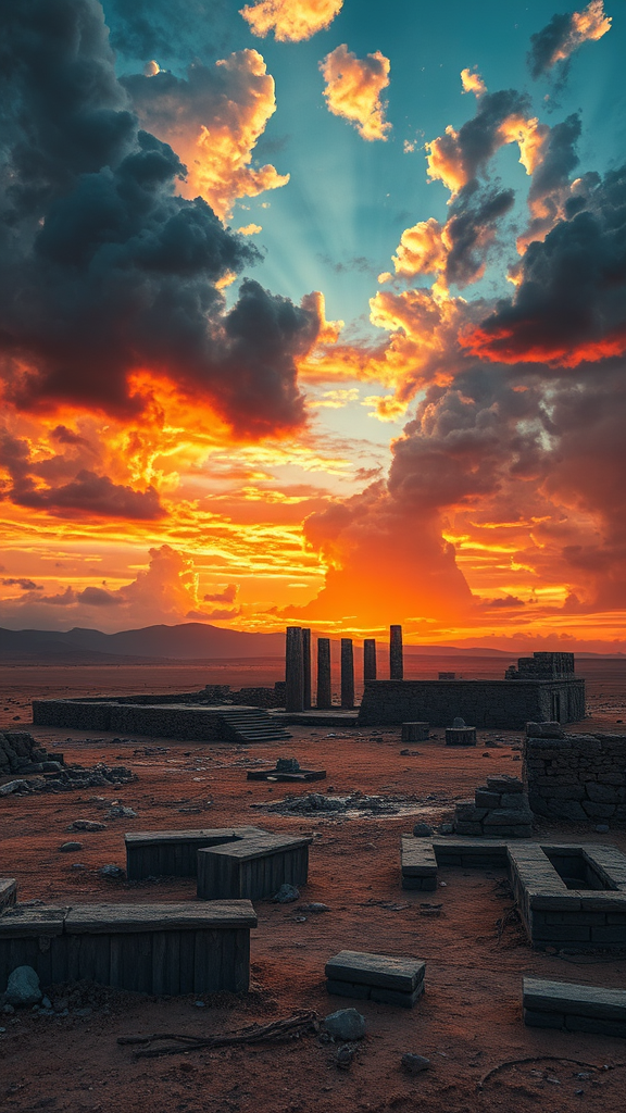 Ruins of an ancient civilization lay scattered across a deserted landscape, illuminated by the vibrant hues of a breathtaking sunset. The epic sky above is painted with dramatic clouds, each detail captured with sharp focus and cinematic clarity. The scene is richly detailed, with textures and remnants telling stories of a forgotten past. The overall composition, inspired by the artistry of Greg Rutkowski, evokes a sense of wonder and nostalgia, as if stepping into a highly detailed studio photograph that bridges the gap between history and imagination.