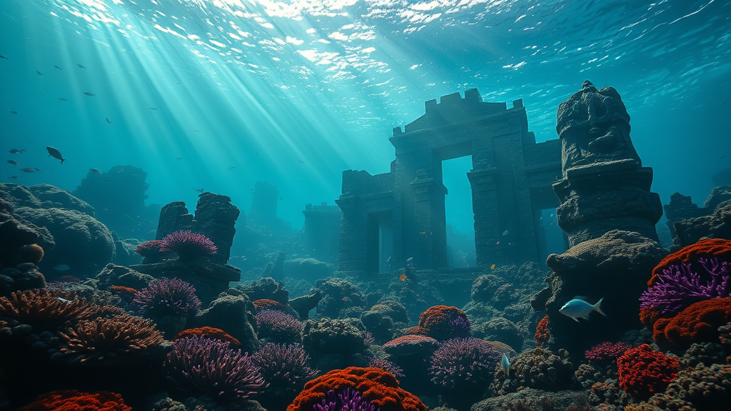 Ruins of an ancient, mystical city, submerged at the ocean's depths, exuding an ethereal, haunted ambiance. Overgrown with vibrant coral, the scene is enveloped in scattered light and cinematic atmosphere. Sunrays pierce the water's surface, casting volumetric lighting and creating deep shadows. A majestic trident statue stands sentinel, surrounded by diverse sea life and darting fish. The underwater landscape is captured in 16k UHD with HDR clarity, featuring intricate details and a dreamy, surreal quality. Depth of field and bokeh effects enhance the sense of mystery, akin to an unrealistic dreamscape, reminiscent of Edwin Deakin's evocative style.