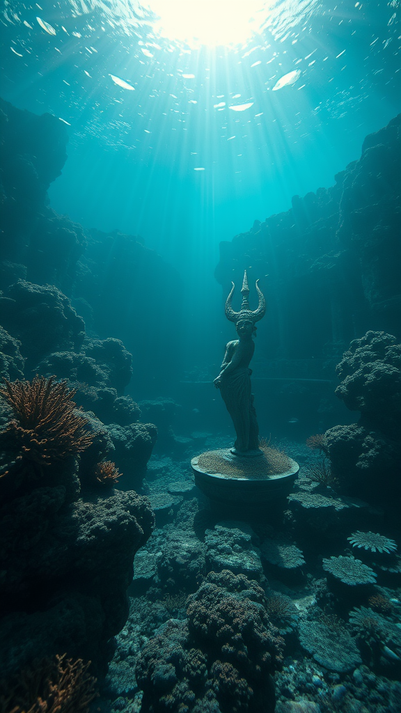 Ruins of an ancient underwater city at the bottom of the ocean, reminiscent of Edwin Deakin's style, ethereal and mystical, hauntingly abandoned with overgrown coral. Sunrays pierce the surface, scattering light to create a cinematic scene drenched in atmosphere. Volumetric lighting casts deep shadows over the landscape, enriching the water's depth. Sea life thrives around a trident statue, adding to the mysterious allure. Bokeh effects lend an otherworldly touch, while precise depth of field and ray tracing enhance the scene. Captured in stunning 16k UHD HDR, it evokes UnrealisticDream's otherworldly charm and FastNegativeV2's haunting beauty.