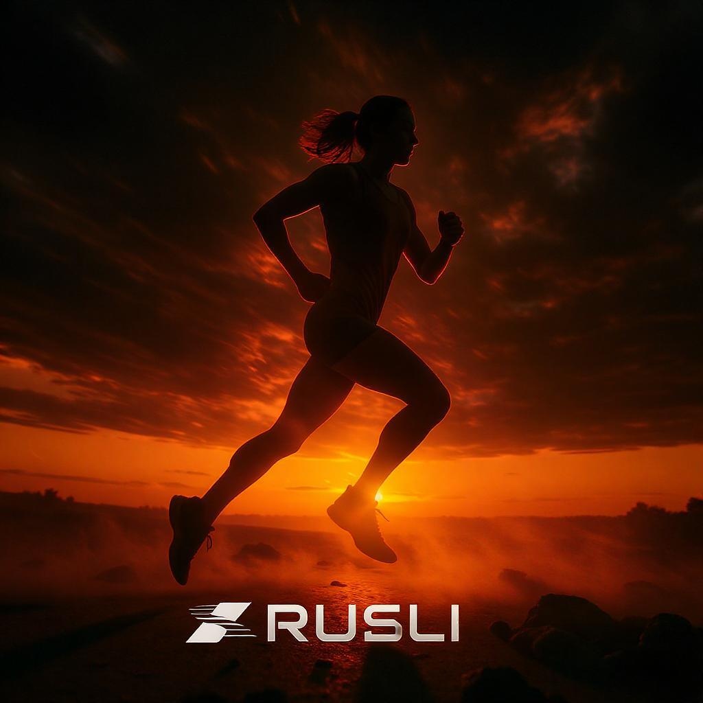 Runner silhouetted against a radiant sunrise, dramatic high-contrast lighting with fiery oranges and brilliant yellow highlights, textured shadows creating depth, dynamic movement captured with cinematic motion blur, styled with sleek professional athletic branding, positioned at the center of the scene.