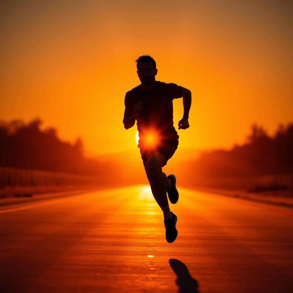 Runner silhouetted against a radiant sunrise, intense high-contrast lighting, vibrant fiery orange and luminous yellow accents, intricate shadows, dynamic motion blur, sleek athletic branding aesthetic, perfectly centered.