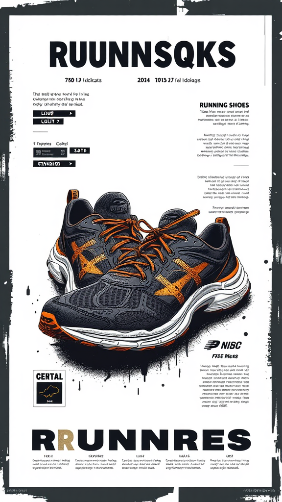 Running shoe poster design, featuring intricate details and a creative layout, showcasing black and bronze color themes. Infographic elements are included alongside marginalia, blending a mix of artistic styles akin to a "bad-artist" aesthetic. The design combines various quality levels, from low to standard, creating a textured effect. Watermarks and JPEG artifacts are subtly present, adding a digital, aged feel. The shoes have exaggerated, unusual features like distorted elements, contrasted against a plain background to highlight the design's unique quirks.