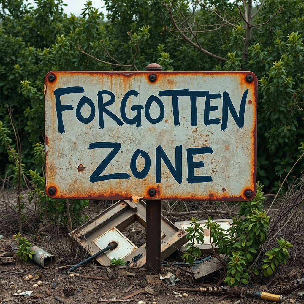 Rusted, bullet-riddled metal sign standing amidst overgrown foliage, displaying the faded, hand-painted words "Forgotten Zone" with peeling edges, surrounded by remnants of civilization's decay scattered across a barren landscape.