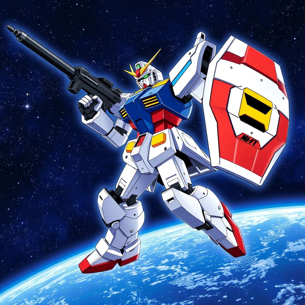 RX-78-2 Gundam in an action pose, holding its iconic shield and beam rifle, inspired by Kunio Okawara's distinct anime style from Mobile Suit Gundam, featuring sleek armor plates with subtle circuitry patterns, vibrant white, blue, and red color scheme, set against a starry space backdrop with a distant Earth, showcasing dynamic light reflections and faint battle scars, emphasizing a heroic and timeless presence.