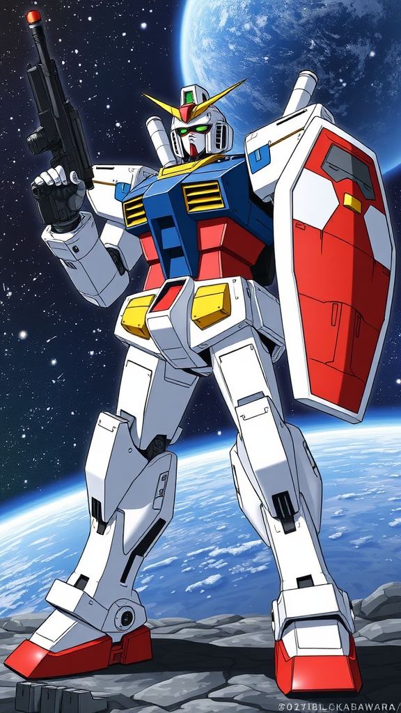 RX-78-2 Gundam standing in a heroic pose, holding its iconic shield and beam rifle, designed with intricate paneling and mechanical details in the style of Kunio Okawara. The Gundam's armor features subtle modifications, like enhanced thrusters and a sleeker, more aerodynamic helmet. Its color scheme includes subtle variations of the classic blue, red, and white, highlighted by metallic accents. The background showcases a dramatic, starry space setting with distant Earth, capturing the epic scale of Mobile Suit Gundam. The overall composition embodies the dynamic energy and aesthetic of classic anime with a modern twist.