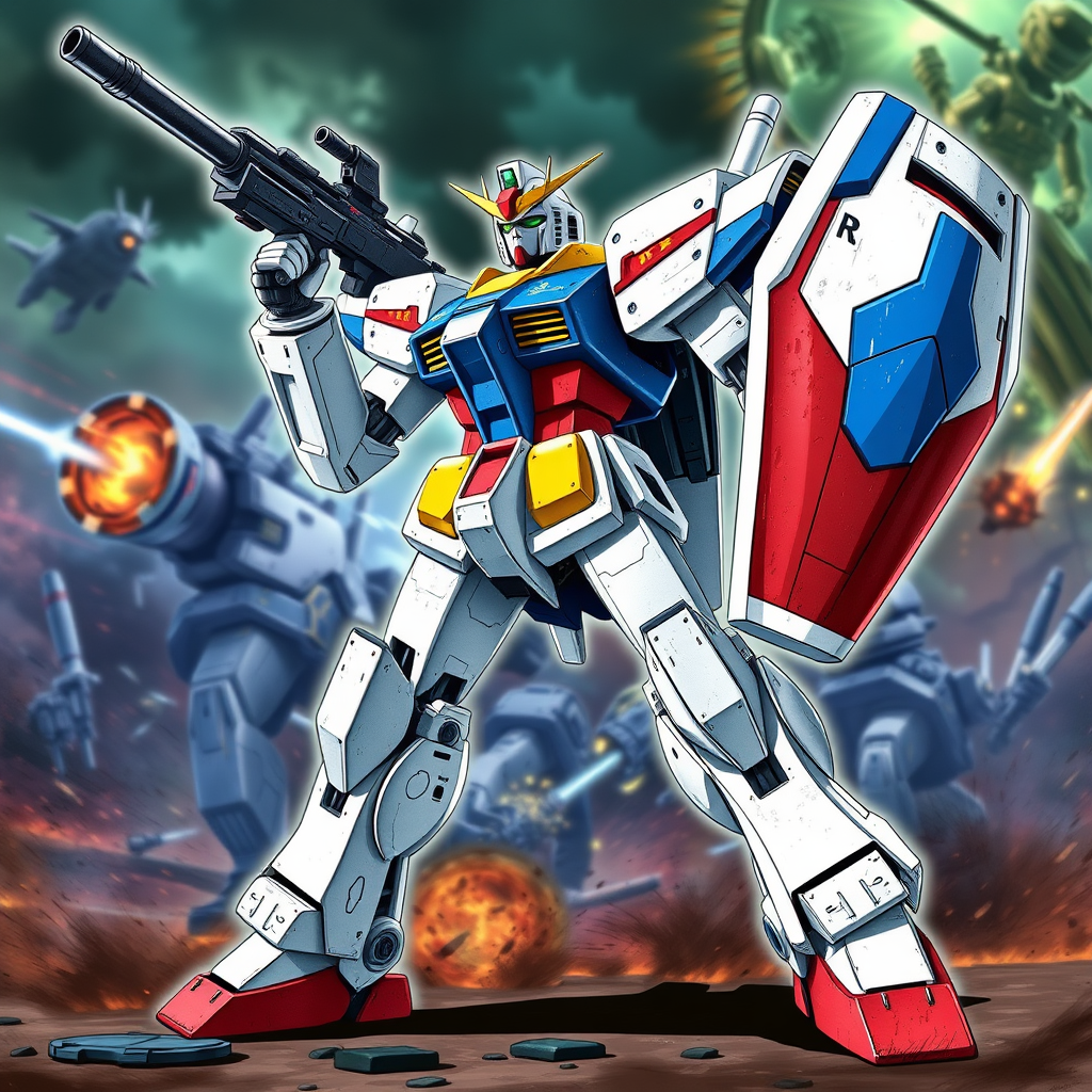RX-78-2 Gundam standing in a heroic pose wielding its iconic beam rifle and shield, detailed mechanical design in Kunio Okawara style, vibrant colors with a slight weathered look, anime aesthetics, featuring dynamic lighting and expressive background depicting a battle scene, Mobile Suit Gundam theme, keep the gundam's signature white, blue, red and yellow color scheme with subtle modifications for a fresh look, focus on realistic metallic textures and intricate panel lines, elongated proportions with a sleek, modern twist, evoke a sense of power and readiness for combat.