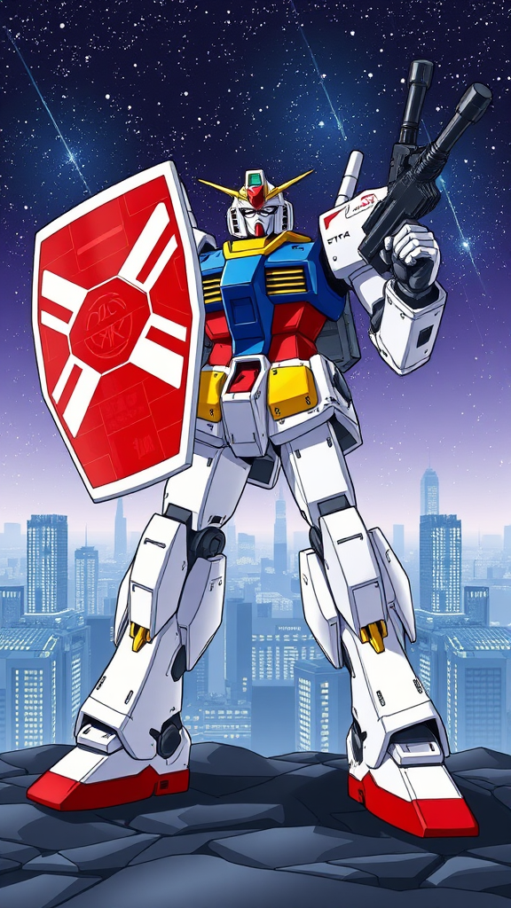 RX-78-2 Gundam standing tall with a dynamic stance, holding its iconic shield emblazoned with bold red and white patterns in its left hand, and a beam rifle in its right hand, against a backdrop of a futuristic cityscape under a starlit sky; the Gundam's armor gleams with touches of metallic blue and yellow highlights, capturing the essence of Kunio Okawara’s design with intricate panel lines and detailed mechanical features, adding subtle battle-worn textures to the white armor plating to suggest a history of battles, while maintaining a vibrant, anime-styled color palette that enhances the classic feel of Mobile Suit Gundam; the setting exudes a sense of epic adventure and nostalgia, invoking the spirit of the original series with slight modernized elements that breathe new life into the beloved design.