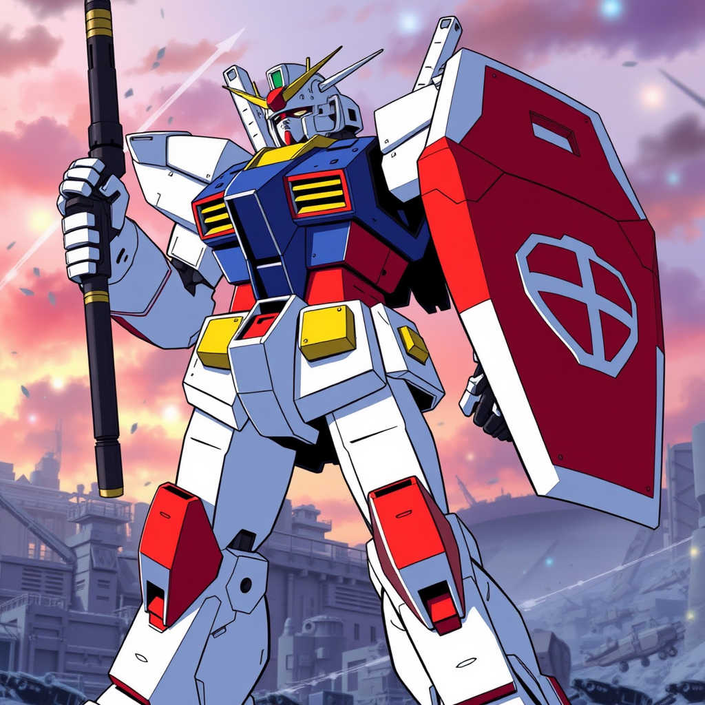 RX-78-2 Gundam stands heroically with its shield and weapon, capturing the essence of Kunio Okawara's anime style in Mobile Suit Gundam. The iconic mobile suit features its signature red, blue, and white color scheme, but with subtle enhancements to its armor for a modern twist. Its shield is slightly larger, emblazoned with a sleek emblem, while the weapon boasts intricate detailing along its barrel. The Gundam's pose is dynamic, conveying a sense of readiness and strength, set against a backdrop of a futuristic battlefield, enhancing the dramatic anime atmosphere.