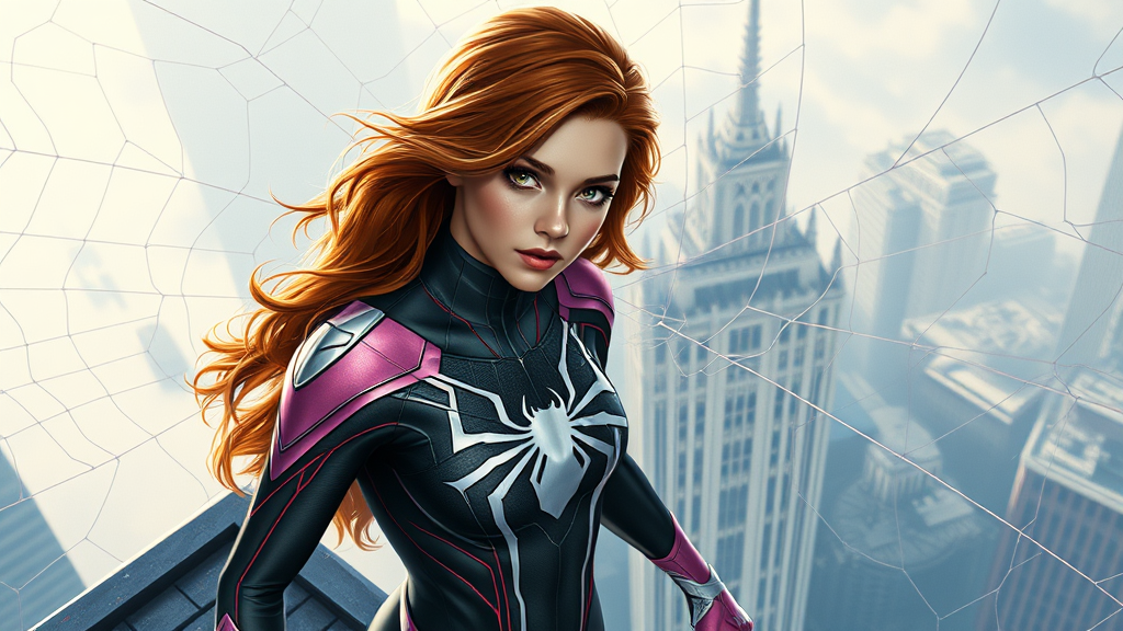 Sadie Sink as Marvel Ghost Spider in a detailed, highly realistic digital painting stands perched at the edge of a building, sporting a fitness body in a sleek Ghost Spider costume. Her stunning, real-life face and expressive eyes captivate as they reflect determination. The costume features an intricately detailed spider logo, enhancing her heroic aura. The flowing lines and elegant compositions reminiscent of Alphonse Mucha blend seamlessly with the modern style influences of Artgerm and Greg Rutkowski. In the background, intricate spider webs weave a mesmerizing tapestry, adding drama to the scene. This concept art illustration boasts smooth, sharp focus and HD quality, capturing Sadie's beauty and the dynamic tension of her pose with vivid clarity.