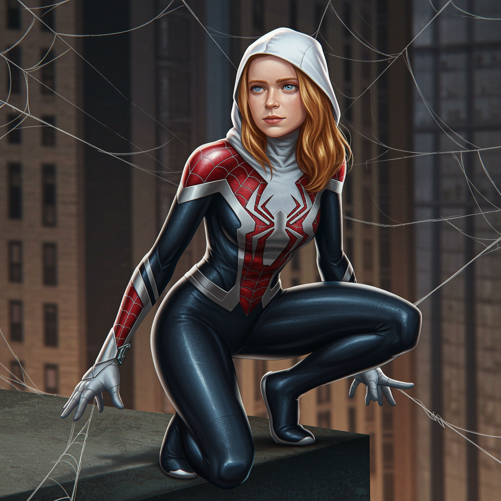 Sadie Sink as Marvel Ghost Spider wearing a detailed Ghost Spider costume stands poised on the edge of a building. Her full body shot reveals a fitness physique, with a beautifully detailed face and expressive eyes. The costume features a prominently detailed spider logo, showcasing intricate design elements. The scene is rendered in HD, with a smooth and highly detailed digital painting style. Inspired by the art of Artgerm, Greg Rutkowski, and Alphonse Mucha, the illustration captures a blend of sharp focus and elegant expression. A background of spider webs adds depth and atmosphere to this concept art piece.