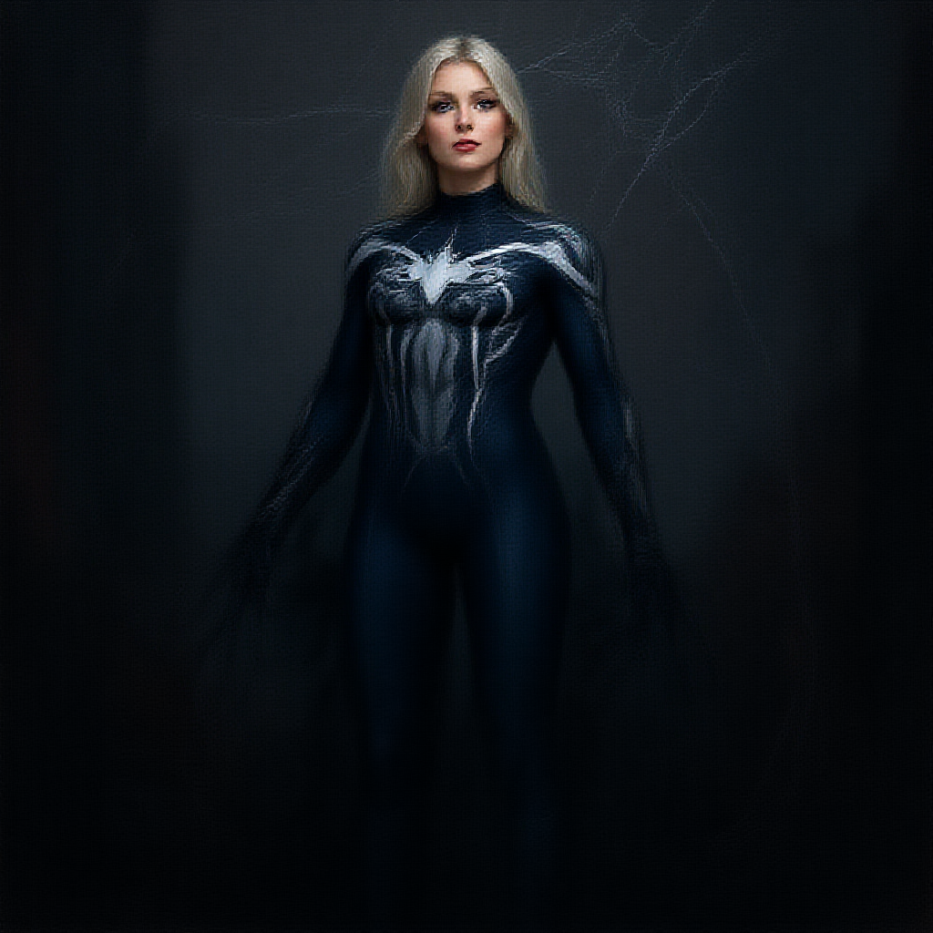 Sadie Sink portrayed as Marvel's Ghost Spider, wearing a detailed Ghost Spider costume. She's standing on the edge of a building in a full body shot, showcasing her fitness body and beautiful, real face with detailed eyes. The costume features a prominently detailed spider logo, capturing the essence of comic book art. The painting is in high definition, with smooth and sharp focus, reminiscent of the styles of Artgerm, Greg Rutkowski, and Alphonse Mucha. The background features a spider web, adding depth and context to the scene. The illustration is a highly detailed digital painting, suitable for concept art and artstations.