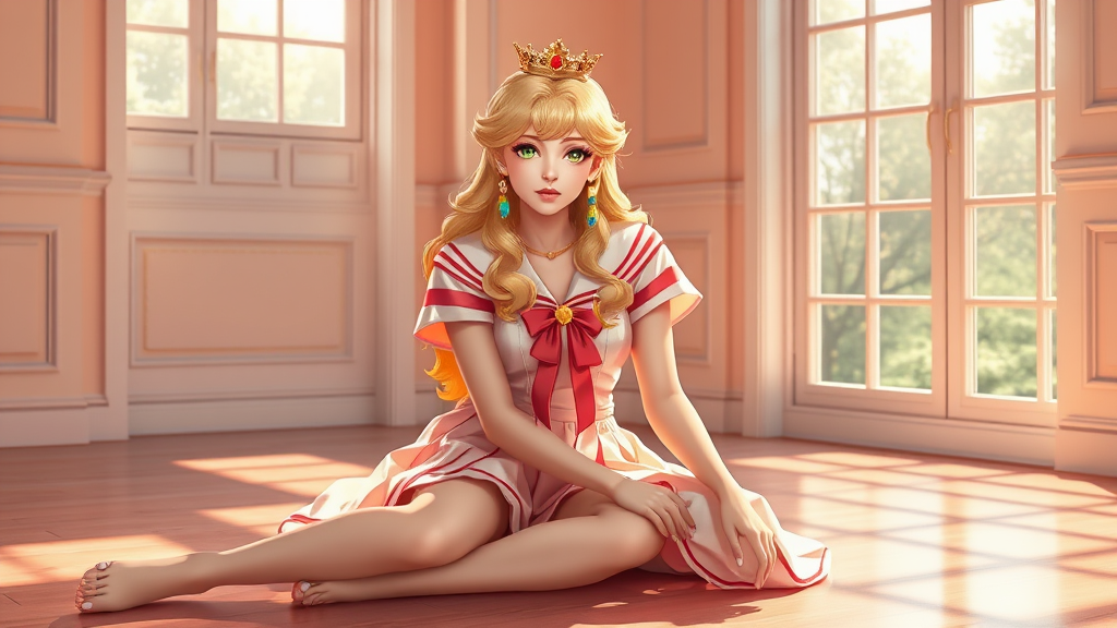 Sailor girl sitting gracefully on the floor in a sunlit room with a large window, a captivating portrait of a regal princess inspired by Princess Peach, a human-like juicy peach essence, 8k high quality and intricately detailed art echoing artgerm styles, luminous peach tones, exquisitely detailed sublime fanart, a majestic princess portrait, fanart worthy of top artstation representation, influenced by dynamic danbooru and artstation aesthetics, ultra-detailed render, golden-blonde haired princess with an aura of elegance.