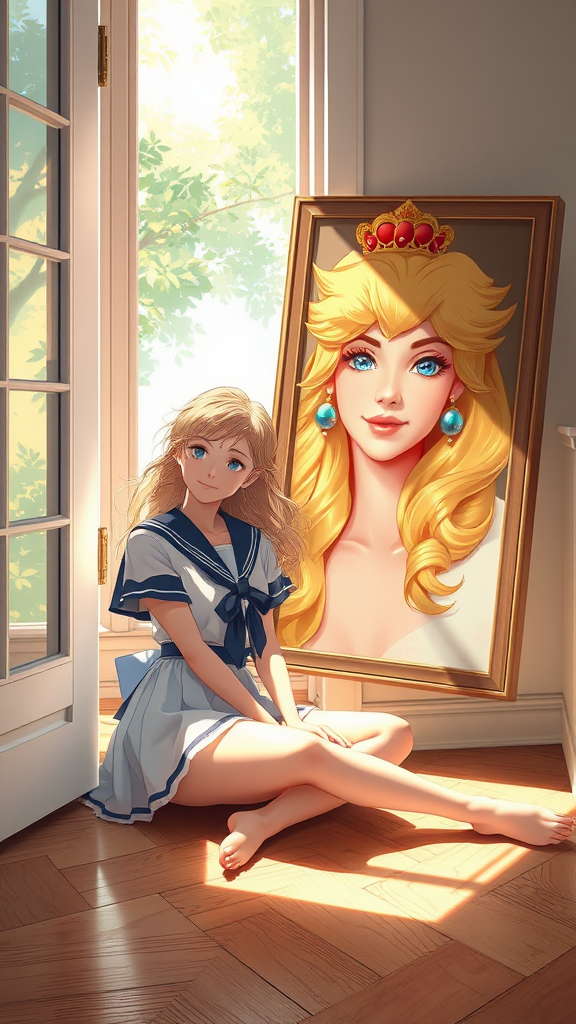 Sailor girl sitting gracefully on the wooden floor inside a sunlit room with an open window, where gentle breezes playfully tease her hair. Beside her is a striking portrait of a princess with blonde hair, reminiscent of Princess Peach, exuding regal elegance and charm. Her features blend with the essence of a human-like juicy peach, creating a unique, whimsical fusion. The art is rendered in 8k high quality, showcasing intricate details and a beautifully crafted style reminiscent of Artgerm. This fanart masterpiece, perfect for Danbooru and Artstation lovers, presents a super detailed render capturing the essence of an exquisite princess portrait, merging whimsy with classical allure in a mesmerizing tapestry of creativity.