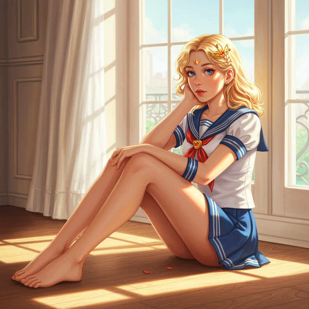 Sailor-themed girl sitting gracefully on the floor of a sunlit room with a large window; in the style of a portrait featuring a regal character reminiscent of a blonde-haired princess; she exudes the essence of a human-like juicy peach; crafted in stunning 8k high resolution with exceptional detail; inspired by the exquisite and artful works seen on ArtStation and Danbooru; capturing the elegance of a princess with a modern twist, rendered with the finesse of a master illustrator.