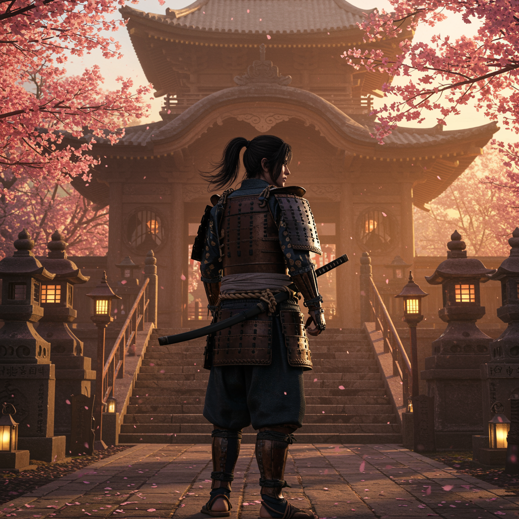 A young samurai with long black hair in a ponytail stands poised in traditional samurai armor amidst the serene ambiance of a Japanese temple. Cherry blossom petals drift gently through the air, illuminated by the warm glow of sunrise and the delicate light of nearby lanterns. The scene features tranquil and ethereal lighting, casting subtle yet dramatic shadows across the temple's ancient architecture. Captured in ultra high resolution, the image conveys hyper-realistic textures with rich colors reminiscent of a professional photo shoot. The physics-based rendering and high detail emulate the look of a cinestill 800 film, producing an image that's both lifelike and artistically refined. The harmonious blend of high contrast and realism creates an immersive experience, ideal for 8K wallpapers.