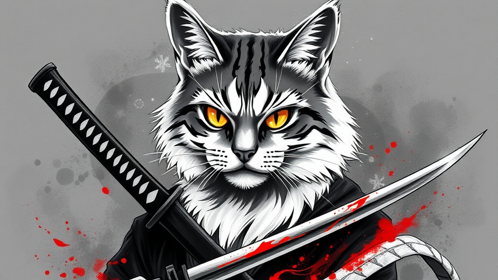 samurai cat with a sleek katana at its side, piercing yellow eyes, monochrome backdrop, hints of crimson and charcoal brush strokes