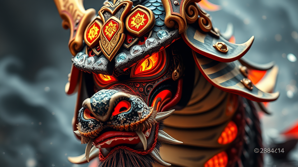 Samurai dragon with fiery eyes, surrounded by shimmering crystal stones, wearing a helmet with tiger-patterned motifs, captured from a close angle with 8k ultra realistic detail, utilizing photography lighting to enhance the ultra detailed, photorealistic features, aspect ratio 4:5, quality 2 with slight creative twists such as swirling mists and subtle iridescent scales.
