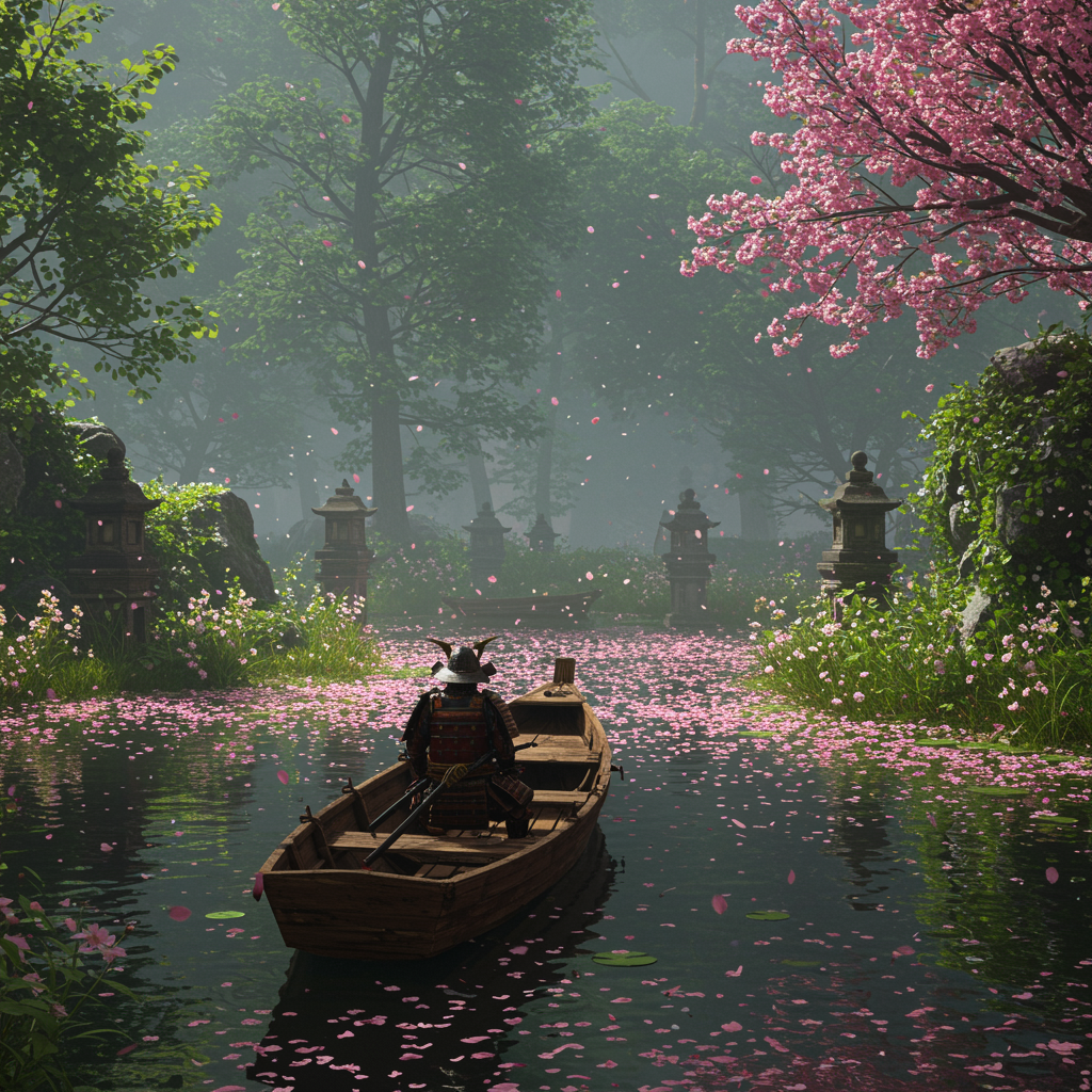 A serene samurai drifts gently in a wooden boat, surrounded by a sea of blooming cherry blossoms, their vibrant pink petals creating a stunning mosaic on the water's surface. The scene is enveloped in lush greenery that shimmers with fairycore enchantment, rendered in ultra-detailed, intricate textures. Dramatic, ambient lighting casts a magical glow, as though the air itself hums with stories untold. The artwork captures the essence of Greg Rutkowski and Magali Villeneuve, depicting a foggy background that adds depth and mystery to the epic, realistic tableau. Each element is hyperdetailed, with cinematic precision in the play of light and shadow, enhanced by muted colors that evoke a sense of tranquility and timelessness. Rim light delicately outlines the samurai, highlighting the intricate patterns on his armor and robes as he becomes one with the breathtaking landscape around him.