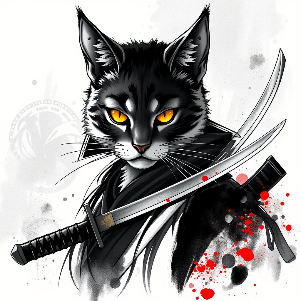 Samurai-feline, with a sleek katana adorning its side, striking yellow eyes piercing through a monochrome backdrop, adorned by subtle splashes of red and dark ink-like strokes, blending elegance with mystery.