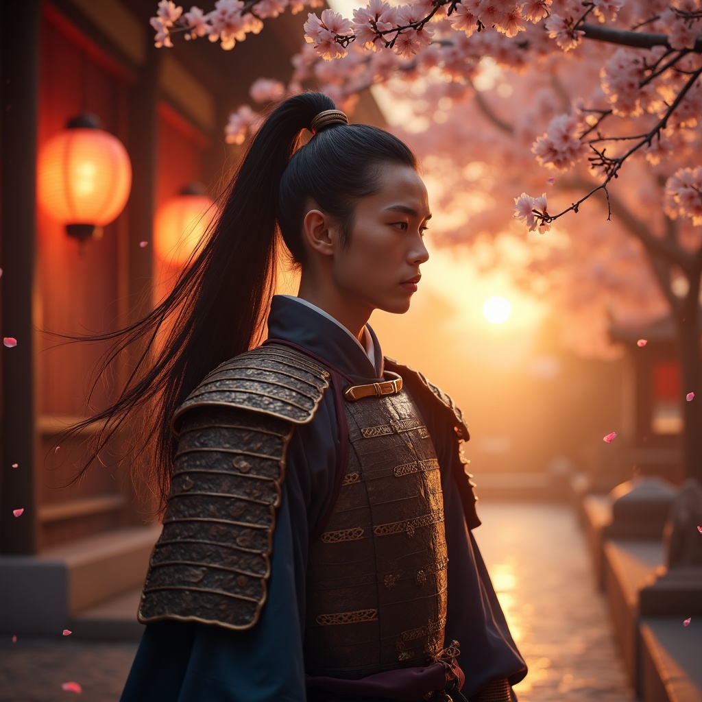 View this AI-generated image featuring a young samurai with long flowing black hair tied in a ponytail donning intricate samurai armor stands confidently in a peaceful japanese temple cherry blossom petals gently drift around him illuminated by the soft glow of hanging lanterns the scene is bathed i