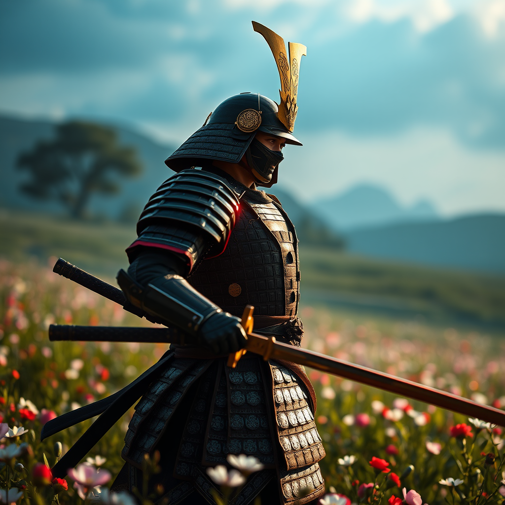Samurai in intricate full armor, donning an elaborate helmet and wielding a finely crafted katana, stands poised on a lush, flower-adorned plain. Bathed in cinematic lighting, the scene is captured through the advanced capabilities of Unreal Engine 5, utilizing editorial photography techniques. Shot using a 70mm lens, the depth of field is precisely defined with tilt blur. The exposure is set at a shutter speed of 1/1000 with an aperture of F/22, while the vibrant colors are brought to life with a white balance of 32k. The image resolution is super-high, captured in ProPhoto RGB, offering lifelike realism. Incorporating cutting-edge VR technology, the composition is epic in scale, reminiscent of the works of artgerm and alex ross. Halfrear lighting and natural backlighting enhance the samurai’s formidable stance. The lighting design embraces moody, cinematic, soft, and volumetric attributes, featuring contre-jour and accent effects with global illumination and sophisticated ray tracing. A subtle red rim light adds drama to his silhouette. Emphasizing optical finesse, the scene showcases scattering and shimmering textures with ray-traced reflections, along with advanced screen space reflections and diffraction grading. Chromatic aberration, GB displacement, and scan lines offer tactile detail. Post-processing integrates cel shading and tone mapping, blending CGI, VFX, and SFX for an ultra-realistic effect. The exquisitely detailed and hyper-realistic depiction offers a dynamic, centered pose, rich in narrative depth and technical precision, embodying a hypermaximalist aesthetic.