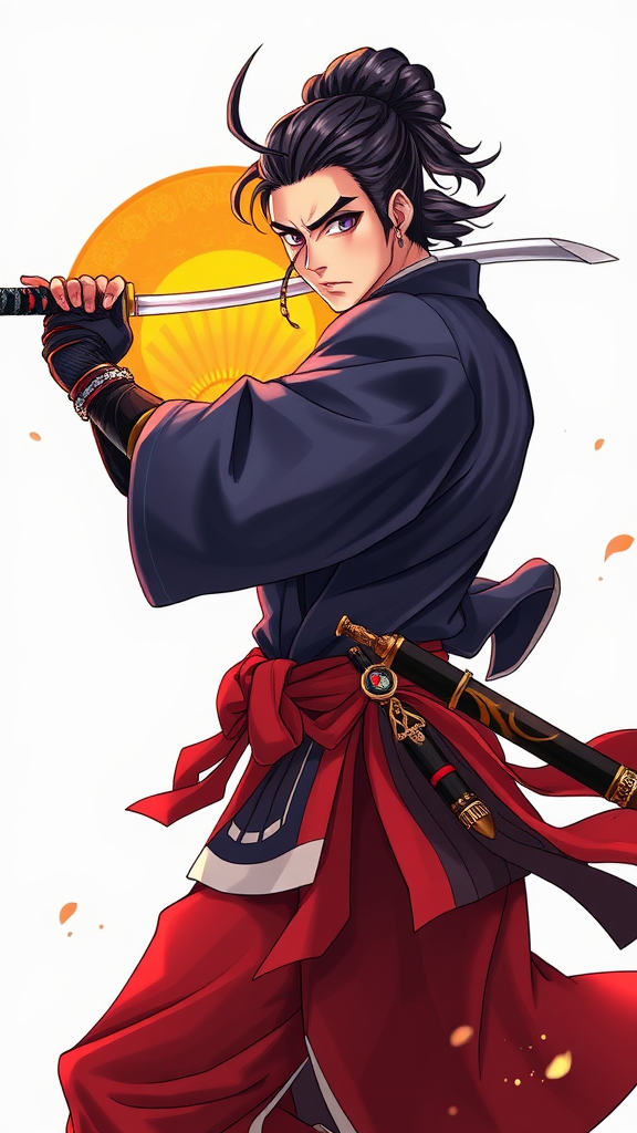 samurai, sword poised over shoulder, kodachi ready, firm grip on sword, laundry pole stance, sheath held strong, arm blade gleaming, ensis exorcizans stance, intricate tsuba, traditional mizura hairstyle, focused battoujutsu stance, elegant sword cane, radiant sunrise stance, tachi drawn, red hakama flowing, detailed tsuka, yukianesa prominent, ancient seven-branched sword commanding respect, twirling weapon with grace, kouhaku nawa interwoven, characterful, distinctive, vibrant, full of character, vivid, detailed craftsmanship, artistic anatomy, dynamic pose, face full of expression, harmonious limbs, graceful hands, balanced presence, in focus, proper proportions, aesthetically pleasing, well-drawn, mature, realistic, artistic composition, colorful, high-resolution, singularity, cohesive design, considered anatomy, coordinated features, harmonious stature, clarity, unified theme, thoughtful presentation, engaging and artistic vision.