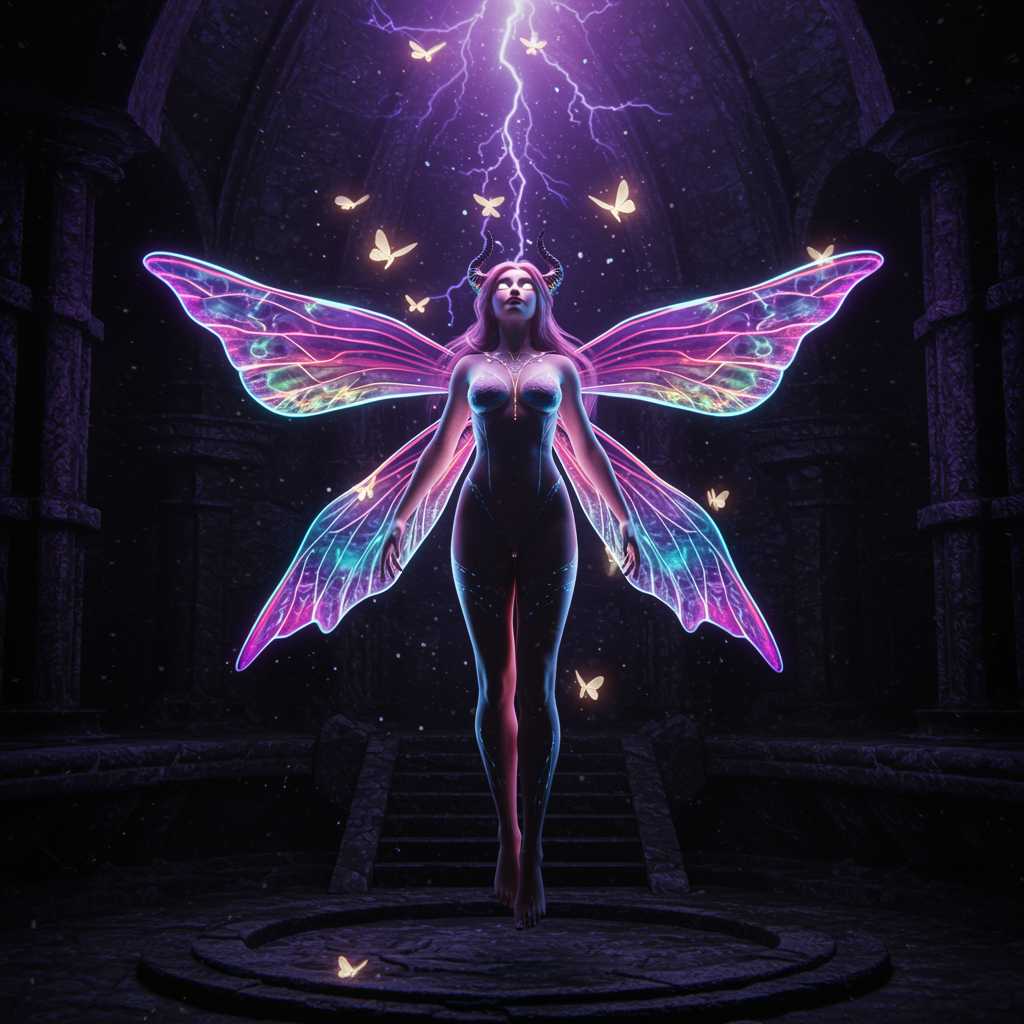 Sanctuary temple, enchanted fairy with a touch of darkness, devilish aura intertwined with ethereal magic, a soul dancing between divine and jinn, demon essence veiled behind clean, glowing skin, lightning particles surrounding a luminous presence. Multi-color fairy wings, as delicate as transparent glass, shimmer in neon hues. Radiant eyes, adorned with full makeup, peer into the swirling energy of the cosmos. A myriad of lighting butterflies flicker around, casting shadows in a dark fantasy realm. The figure levitates, head lifted skyward, capturing a moment of celestial wonder. This masterpiece, a symphony of perfect anatomy, is rendered in stunning 32k UHD with an eye for professional photography. Cinematic angles emphasize brilliant, vibrant colors and intricate detail. Vivid emotions draw the viewer into a hyper-realistic composition, as if crafted by daz3d. Captured in RAW, the wide shot highlights this fantastical scene, merging creativity with a sense of otherworldly beauty.