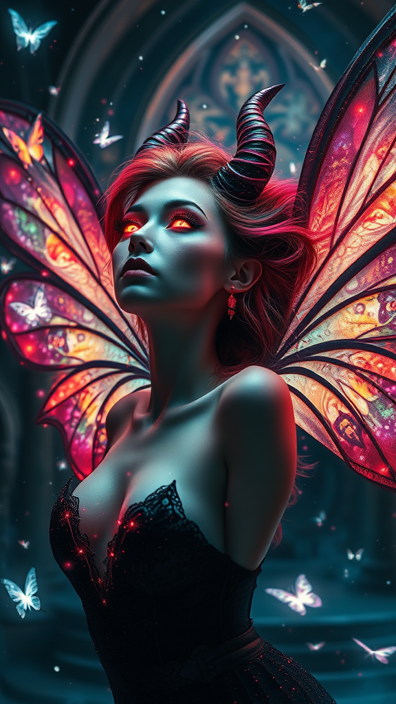 Sanctuary temple enveloped in an aura of dark magic, where a devil fairy with luminous, neon multi-color hair and glowing eyes embodies a fusion of divine and demonic essence. Her glass-like wings shimmer with particles of lighting, casting a kaleidoscope of vibrant colors. Swirling energy surrounds her clean skin, as her flawless makeup enhances her otherworldly beauty. Lighting butterflies flutter in a dark fantasy realm, heightening the enchanting atmosphere. She levitates, gazing skyward with a profound expression, as the cinematic angle captures her perfect anatomy in stunning composition. The scene, awash with cinematic lights, vibrant colors, and hyper-emotional depth, is presented in 32k UHD resolution, embodying the highest quality of professional photography, akin to a masterpiece crafted by daz3d in RAW, delivering a brilliant and vividly detailed portrayal.