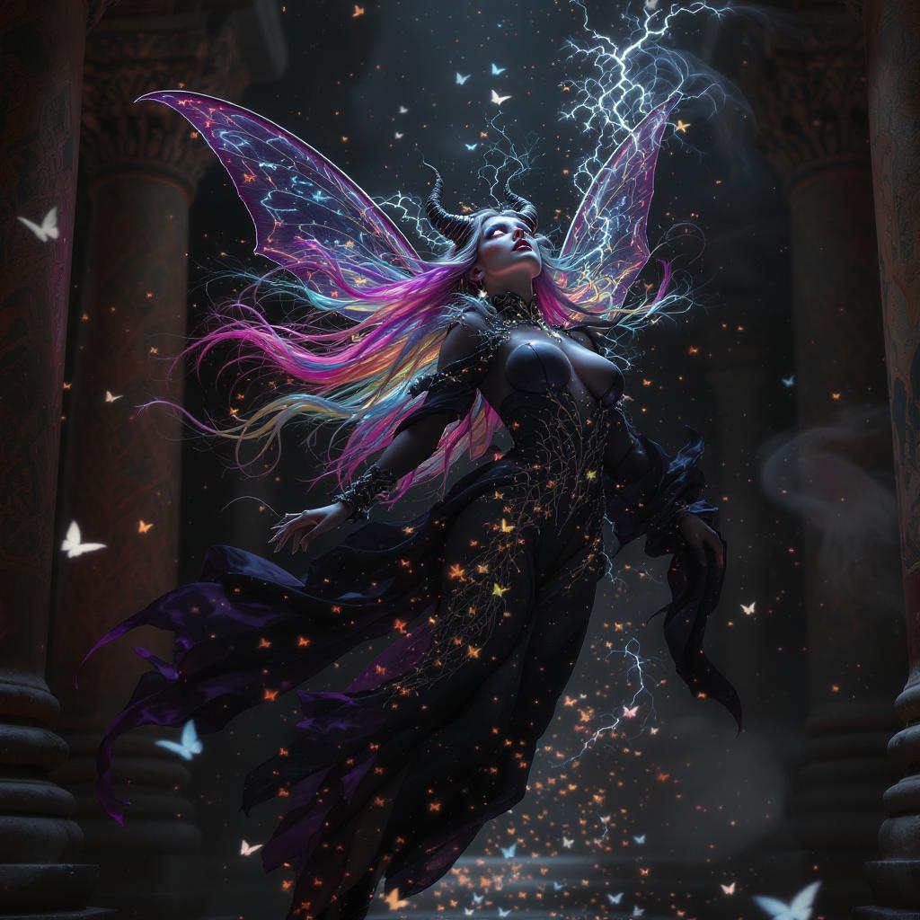 Sanctuary temple housing a devil fairy cloaked in dark magic and a devil soul intertwined with a jinn and demon essence, exuding divine presence. Her clean skin is adorned with particles of lightning, while her translucent glass-like fairy wings shimmer in a tapestry of vibrant colors. Neon multi-color hair cascades around her face, framing glowing eyes enhanced by full makeup. A swirling energy surrounds her, merging with a depth of field enhanced by an abundance of glowing butterflies. In a dark fantasy tableau, she levitates gracefully, head lifted, eyes skyward, captured in a masterful composition of perfect anatomy in 32k UHD resolution. The scene is of the highest photographic quality, embodying a professional portrait with cinematic angles and lighting, brilliant and vibrant, with vivid colors in stunning detail. It evokes a hyper-emotional response, reminiscent of a creation by a Daz3D artisan, presented in a RAW wide shot capturing a central narrative while adding a unique creative flair.