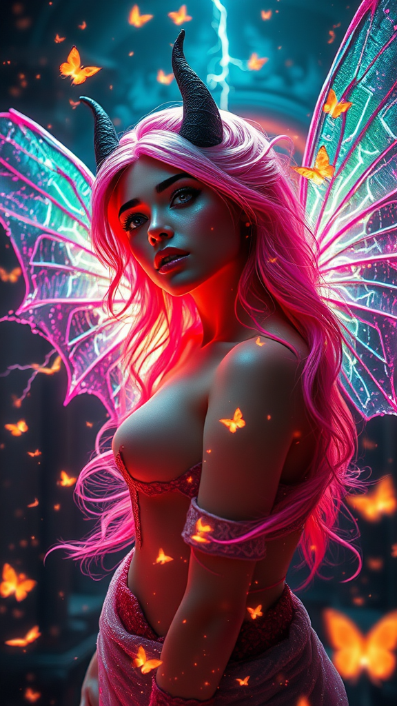 Sanctuary temple infused with the essence of a devil fairy, surrounded by an aura of dark magic and the presence of a devil soul intertwined with jinn and demon spirits. The scene captures divine energy with a figure possessing flawless skin, adorned with particles of lightning and shimmering multi-color fairy wings, delicate as transparent glass. Her neon multi-color hair cascades with a life of its own, framing eyes that glow with intensity. Full makeup accentuates her ethereal features, while swirling energy envelops her being. The depth of field emphasizes an atmosphere alive with luminous butterflies dancing in the darkness. She is levitating, head tilted gracefully towards the heavens, exuding the essence of a masterpiece. The image is a 32k UHD resolution tableau of perfect anatomy and realism, exuding the quality of a professional photo shoot. Captured with cinematic angles and lighting, the scene bursts with brilliant, vibrant, and vivid colors, creating a highly detailed and stunning composition. Emotion is palpable, brought to life using DAZ3D in RAW format, framed in a wide shot, capturing the essence of a dark fantasy world.