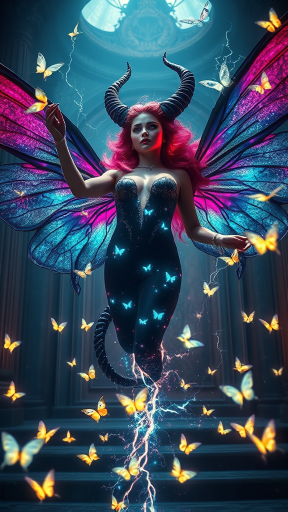 Sanctuary temple setting with a devilish fairy embodying dark magic, a fusion of devil soul and jinn essence. This demon with divine aura boasts clean skin shimmering with particles of lightning. Her multi-colored, glass-like fairy wings are ethereal, complemented by neon multi-hued hair and glowing eyes. Full makeup accentuates her features, surrounded by swirling energy. A depth of field reveals numerous luminous butterflies fluttering around her, creating a dark fantasy ambiance. She levitates, head lifted skyward in a moment of transcendence. Captured as a masterpiece with perfect anatomy, the scene is rendered in 32k UHD resolution, showcasing the best quality high-res realistic photo. Professional photography highlights cinematic angles and lighting, delivering a brilliant, vibrant scene with vivid color and highest detail, resulting in a stunning composition imbued with hyper emotional depth, realized in daz3d. A captivating wide shot with raw authenticity and a dynamic portrayal.