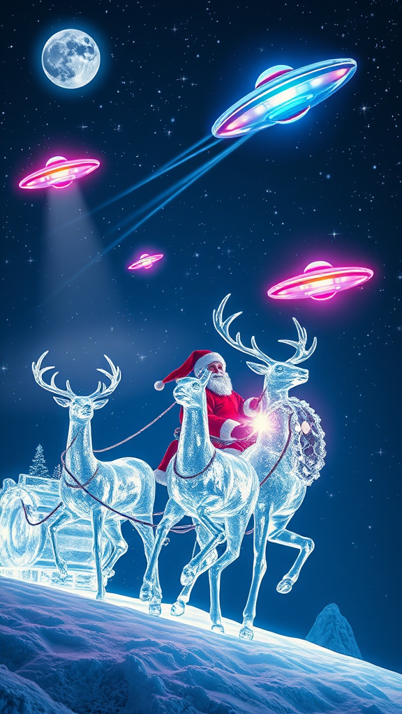 Santa in a shimmering ice sleigh, gracefully gliding through a star-studded sky, is pulled by majestic ice-carved deer, their crystalline antlers shimmering in the moonlight. Above, a cosmic ballet unfolds as luminous UFOs zip across the heavens, engaged in an ethereal dogfight with the enchanted sleigh, their otherworldly lights casting vibrant colors on the icy sculptures.