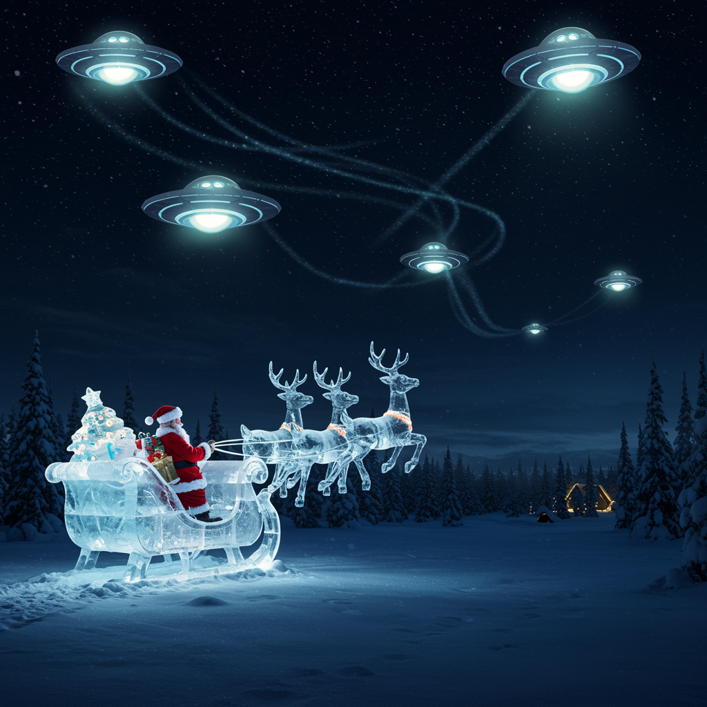 Santa's enchanting sleigh, intricately carved from shimmering ice and drawn by a majestic team of crystalline ice deer, soars high above a wintry landscape. The night sky is alive with a fantastical dogfight, as Santa's magical procession maneuvers around glowing, otherworldly UFOs, casting a dazzling spectacle of light and wonder on the snowy world below.