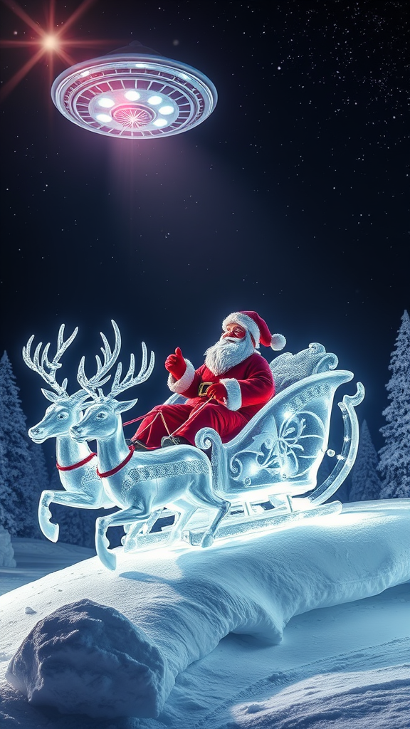 Santa's frozen sculpture in an enchanted ice sleigh, pulled by majestic ice-carved reindeer, soars through the sparkling night sky, engaged in a whimsical aerial dance with a shimmering UFO, casting a magical glow over a winter wonderland.
