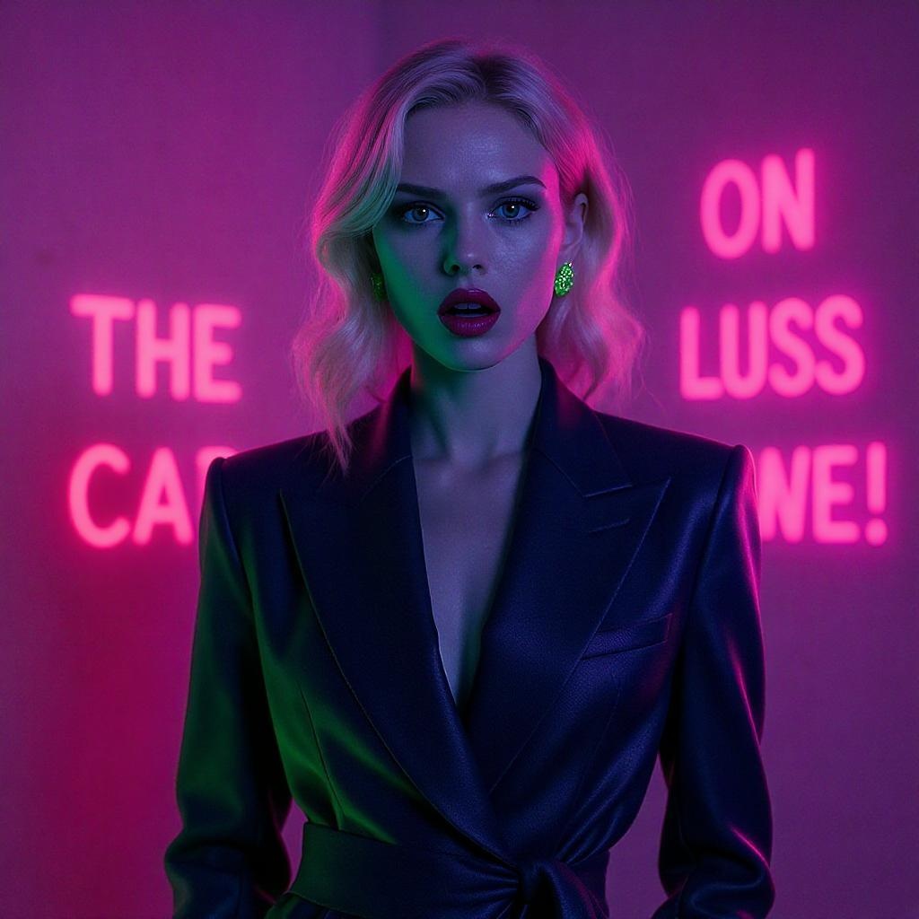 Sasha Luss elegantly posed, draped in bold attire, captured with the clarity of a cinema camera, her expression an intense blend of neon-lit emotion, a silent scream echoing through vivid text and glowing hints of vibrant edema.
