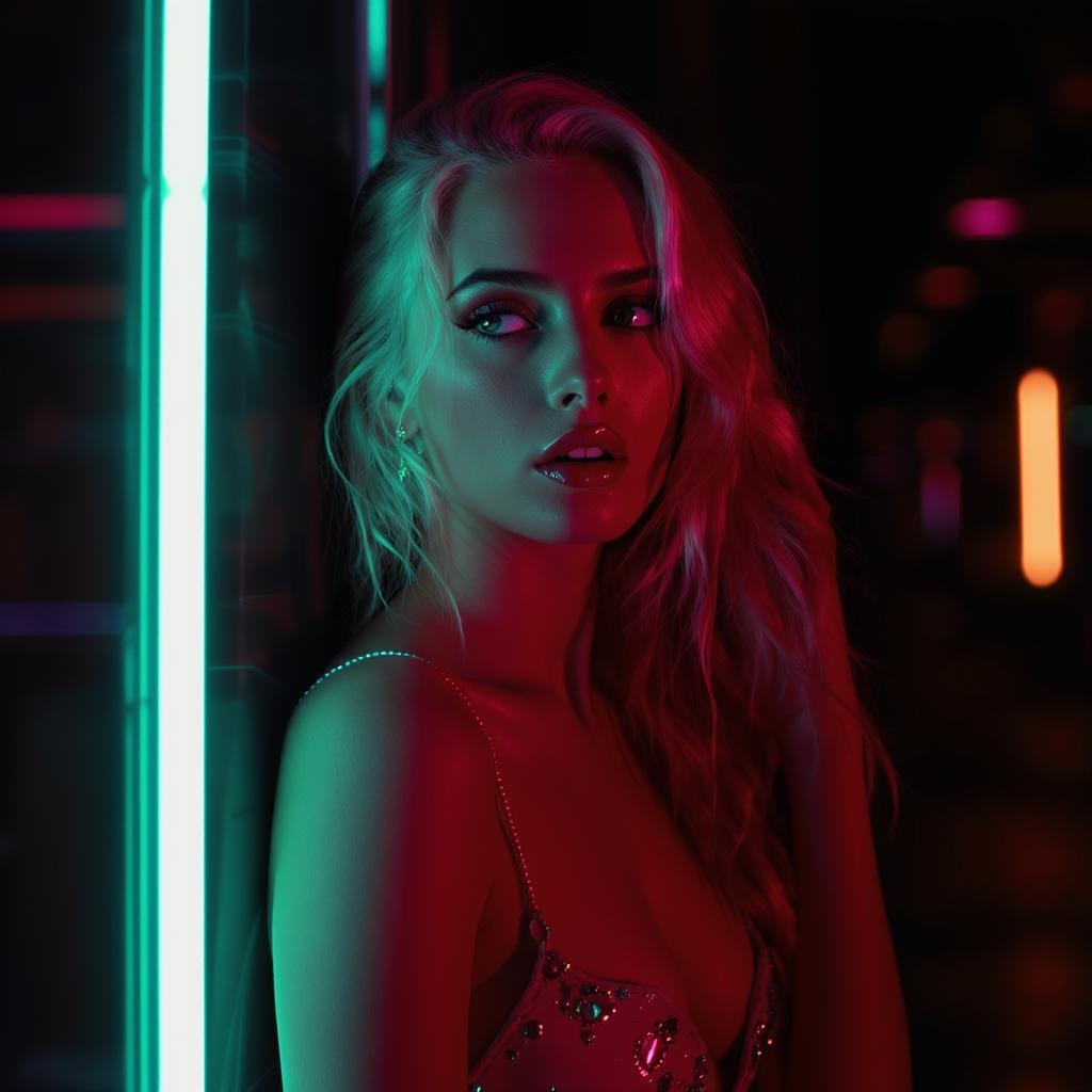Sasha Luss elegantly posing, illuminated by the vibrant glow of neon lights, her form captured with the precision and depth of a cinema camera. A subtle hint of drama emerges as her expression teeters on the edge of a silent scream, the composition evoking both the surreal and the emotional.