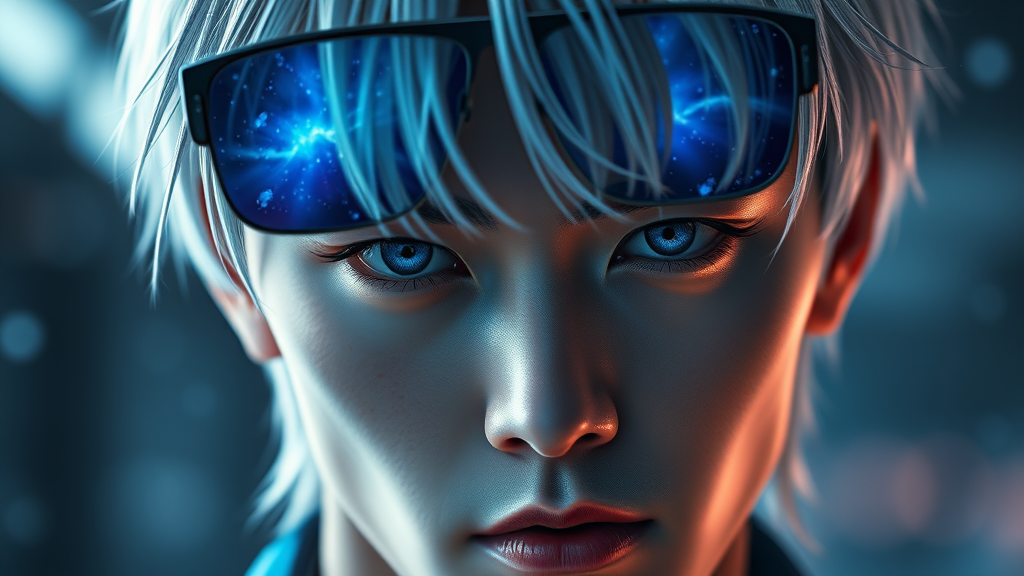 Satoru Gojo, inspired by Jujutsu Kaisen, a strikingly handsome man with medium-length, white hair, sporting stylish sunglasses perched on the tip of his nose, revealing his mesmerizing deep blue eyes filled with cosmic wonder, as if galaxies reside within them, engaging the viewer in a captivating gaze, rendered in hyper-realistic detail with an atmospheric ambiance, captured in stunning 8k resolution.