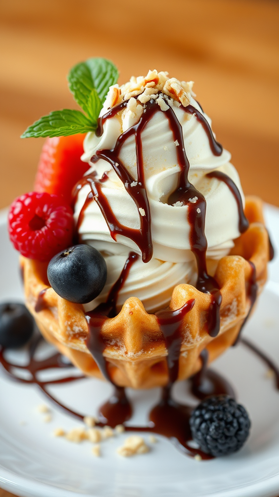 Savor luscious ice cream nestled in a crisp waffle cup shaped like a half sphere, adorned with a medley of fresh berries and drizzled with rich chocolate sauce, topped with a sprinkle of crushed nuts and a hint of mint.