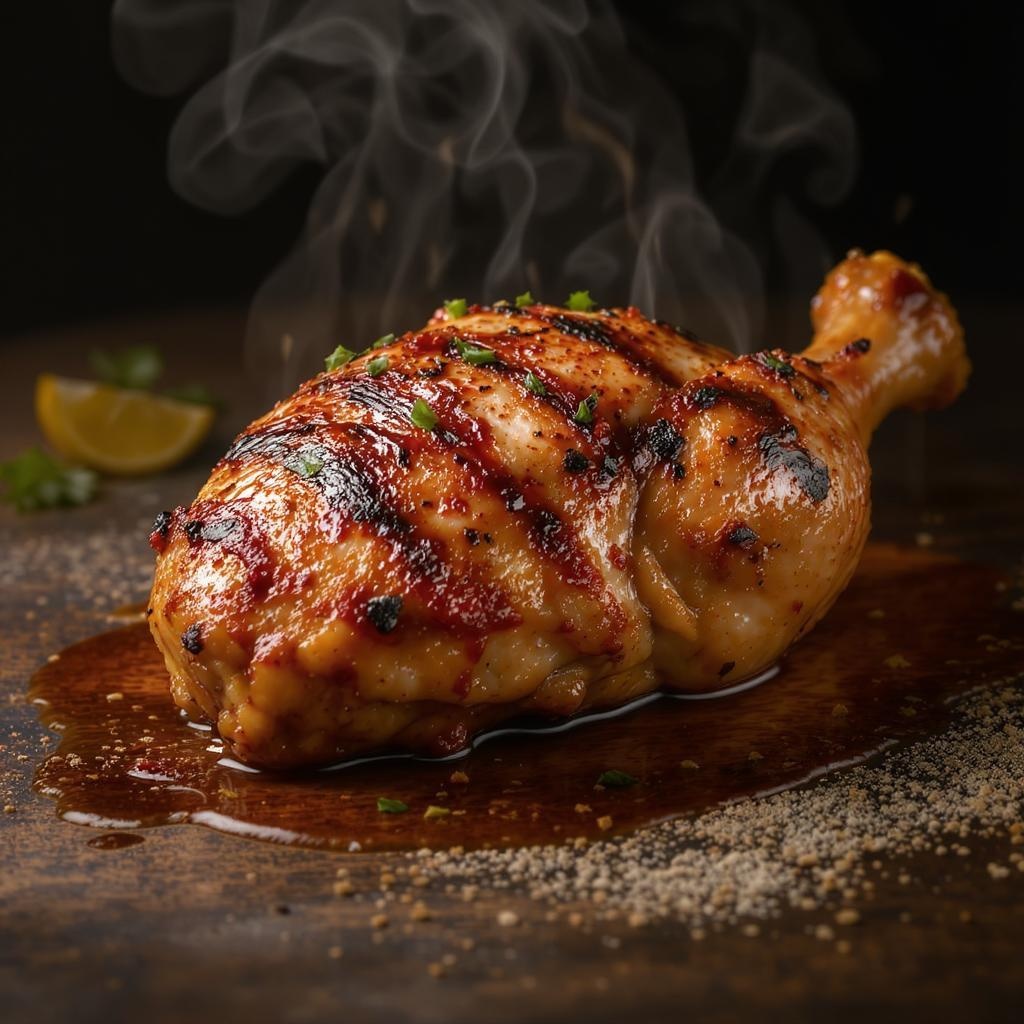 Savory grilled chicken, vibrant food photography, expert food styling, wide-angle composition, lens 85 mm, f 11, studio setting, hyper-detailed, rendered in octane, 8k resolution, --q 2 --s 1000 --ar 2:3, enhanced textures with a slight smoky aura, rich color palette with charred highlights, focus on succulent juiciness, atmospheric background softly blurred to accentuate the dish.