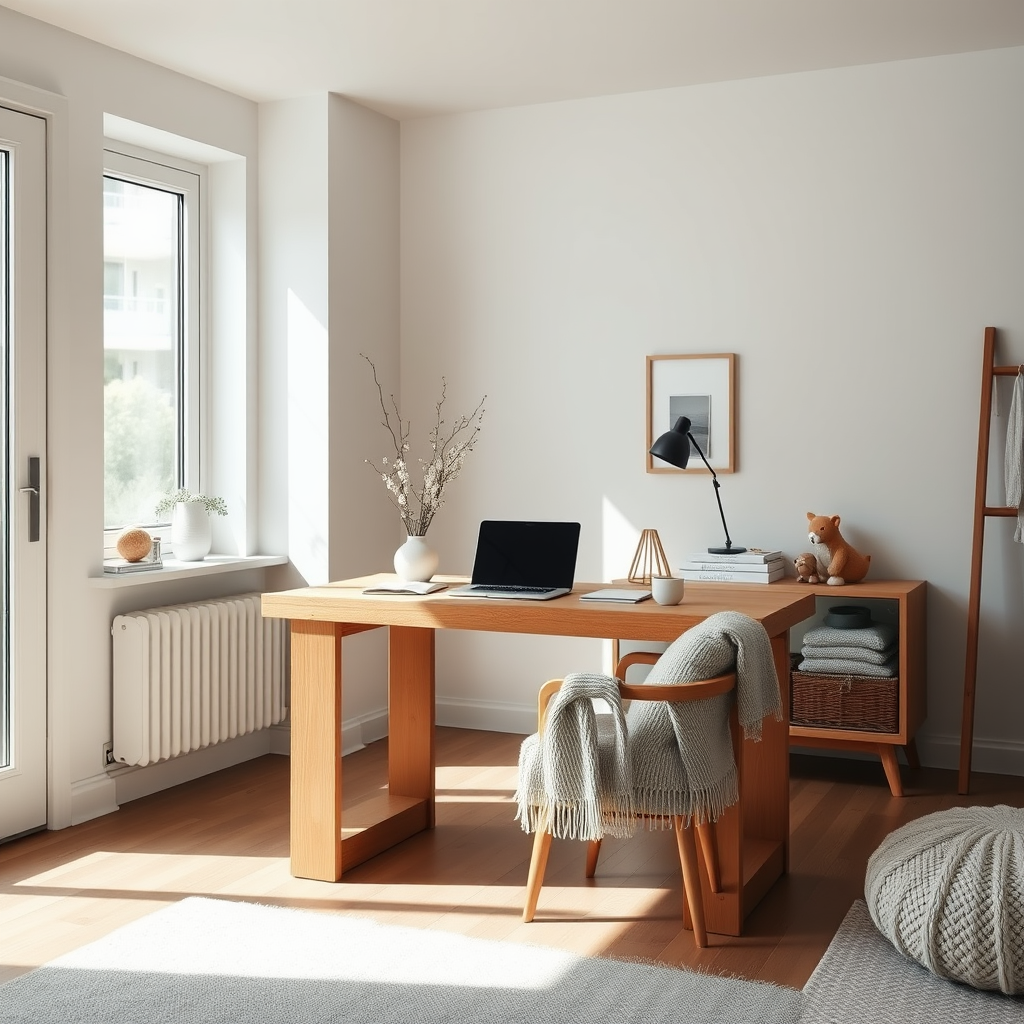 Scandinavian-inspired home workspace featuring a sleek natural oak desk, softly illuminated by daylight streaming through a large window, elegantly captured from a low angle to accentuate the airiness and openness of the room, with minimalist décor and cozy textiles adding warmth.