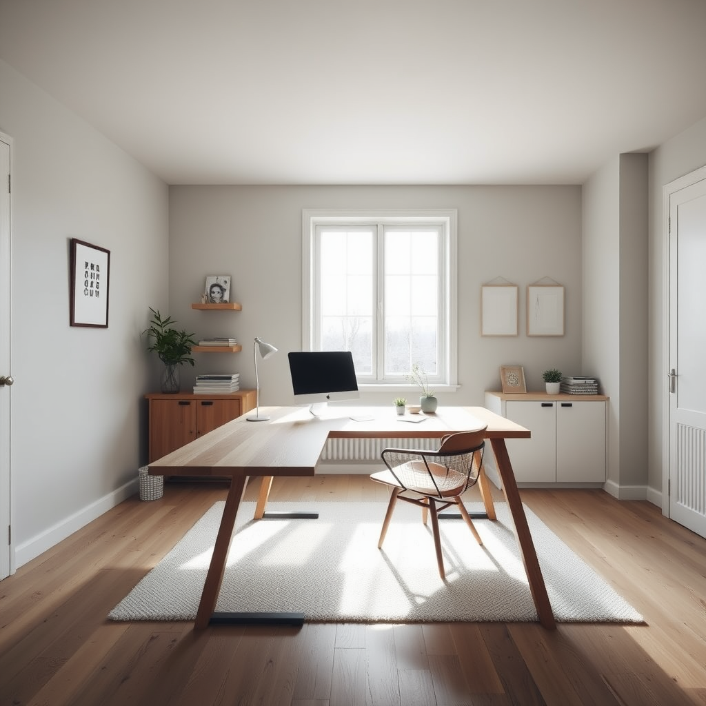 Scandinavian-inspired home workspace featuring a sleek ash wood desk, softened by the gentle glow of natural light streaming through a large window, photographed from a low angle to accentuate the airy and expansive feel of the room.