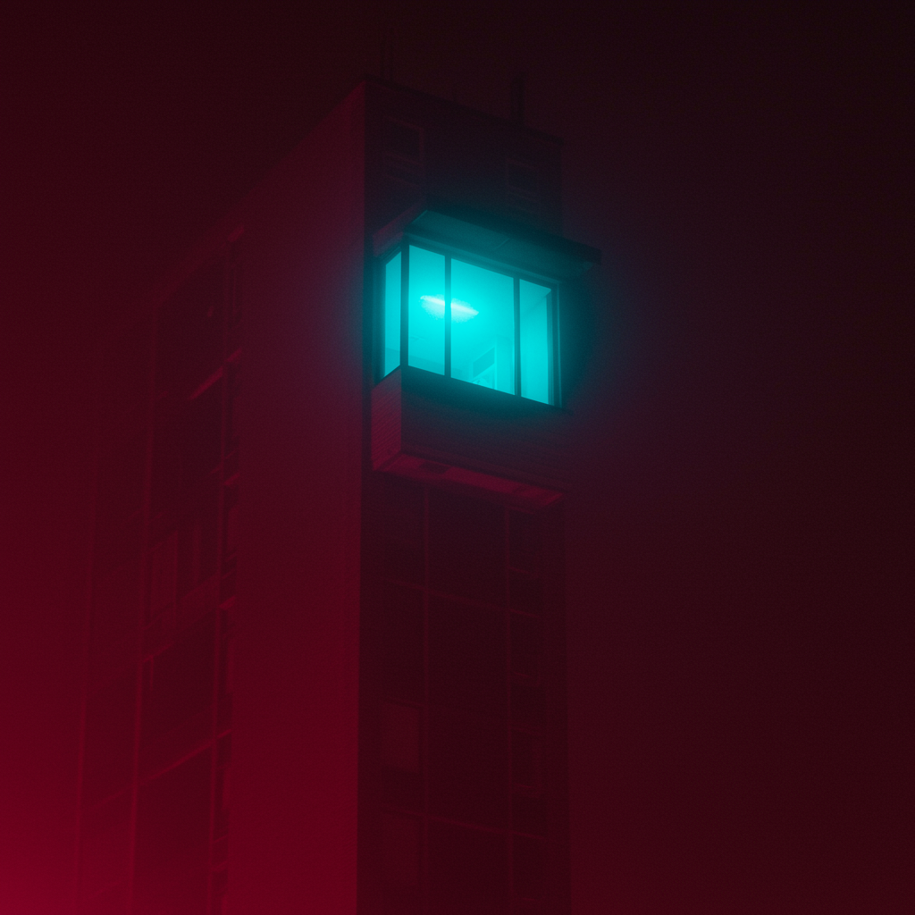Scene Capsule: A night-shrouded tower disappears into a plum-hued fog, only to be punctuated by a solitary cyan window high in the cantilevered penthouse. This window casts a volumetric glow reminiscent of a distant beacon, suggesting echoes of life amid desolation. Camera Block: Sony A1 | 135 mm f/1.8 GM | ISO 3200. Capture at 1/80 s handheld, preserving an intentional micro-blur for atmosphere. Aim from a low vantage, emphasizing the building's imposing stature, with focus drawn to the enigmatic window. Lighting Block: A deep crimson haze from street-level sodium lights bathes the scene. Interior CRT luminescence seeps through blinds, creating shadowy vertical textures in the mist. No alternate sources. Motion & Capture Feel: A deliberate, creeping slider movement at 24 fps; subtle vertical gate weave adds a vintage film feel. Post & Colour: A split-tone aesthetic—rich bordeaux tones paired with electric-blue highlights. Deep blacks crushed to nil; halation softly encircles the window; a thin layer of 35 mm grain pervades. Vibe Tagline: “Connection restored—silent tower pulses with life after two decades.”
